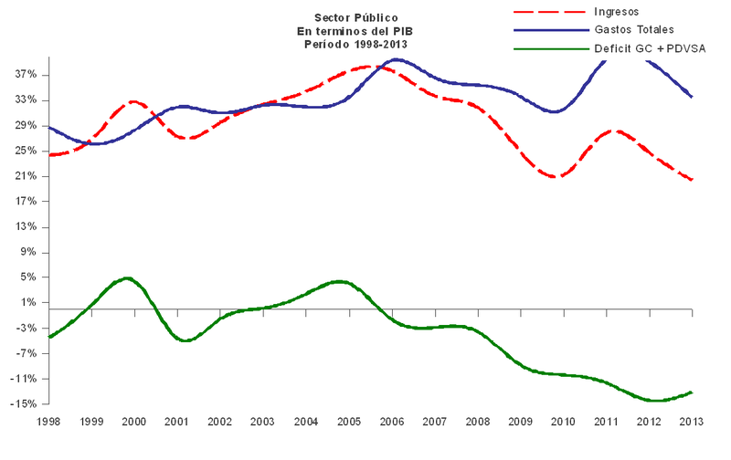 1. El déficit fiscal ha crecido de manera endémica, según el siguiente gráfico, desde el 2007, a pesar de los altos precios petroleros, llegando a 15% del PIB en del 2012.